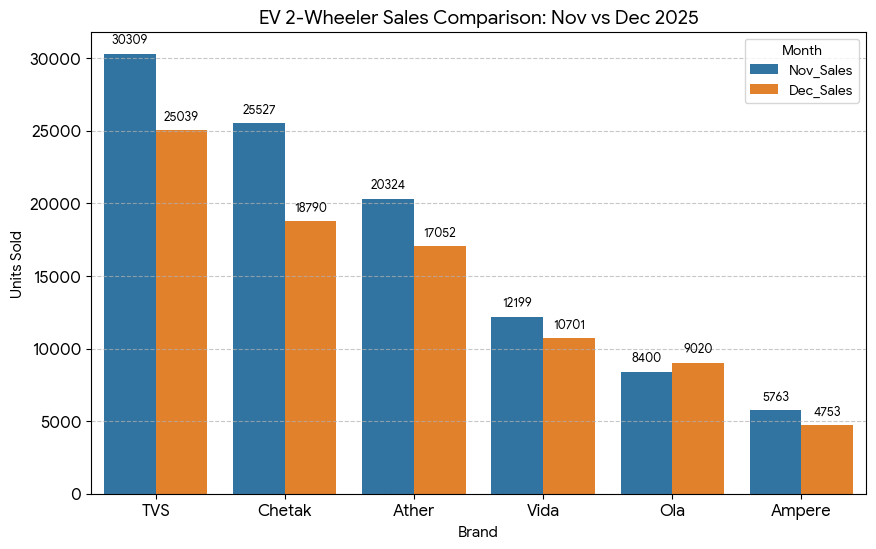 Ather Energy demonstrated relative resilience. While it also faced a 16.1% decline, selling 17,052 units, it managed to narrow the gap with the #2 player, Bajaj Chetak. With only roughly 1,700 units separating the two in December, the "Battle for Silver" is set to heat up in Q1 2026. Ather’s consistent performance suggests its community-driven model remains robust even in lean months.
